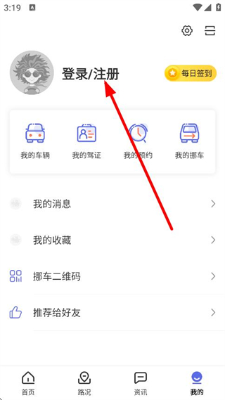 2、在个人页面,点击登录/注册,进入登录注册页面。