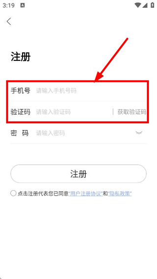 4、在注册页面,输入手机号后点击获取验证码,输入验证码。