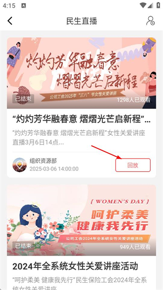 2、在民生直播列表界面点击直播条目旁的回放,进入直播详情界面。