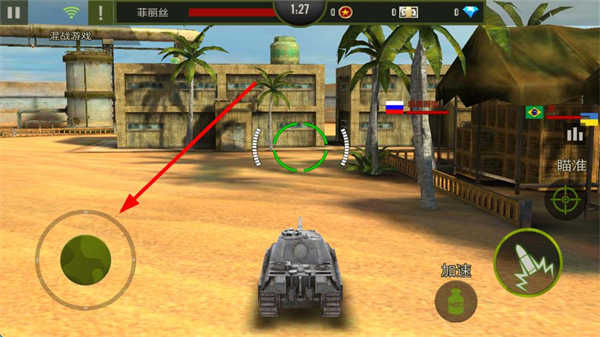 1、进入游戏后,通过左下角虚拟摇杆操控坦克移动,可自由调整方向和行驶路线,利用地形走位躲避敌人攻击。