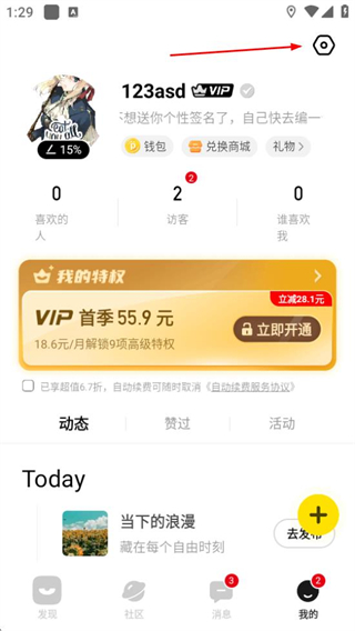 2、在个人中心界面点击右上角设置图标,进入系统设置界面。