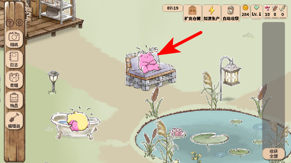 内置菜单降低操作门槛与时间成本,无高压任务与进度限制,玩家可随心规划田园布局、与青蛙互动玩耍,温馨的画面搭配便捷的功能,让你每次都能放松身心。