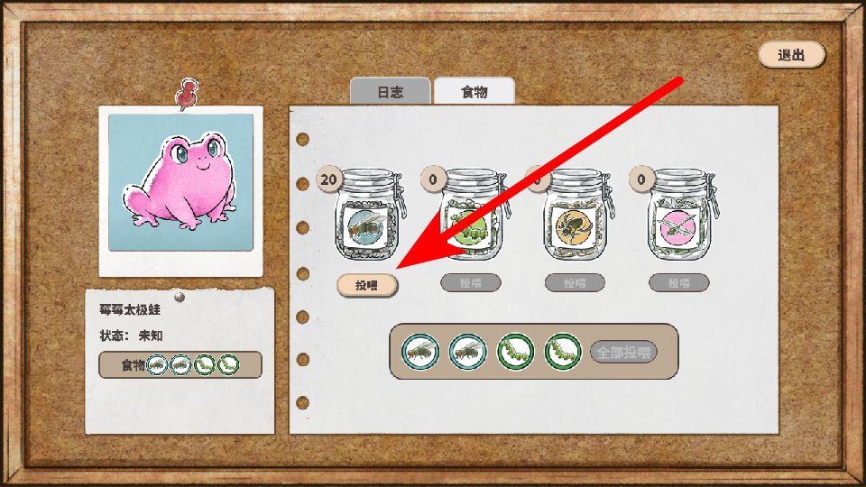 2、进入青蛙的食物界面,点击投喂按钮,投喂对应食物,满足青蛙饮食需求,推动其状态发展。