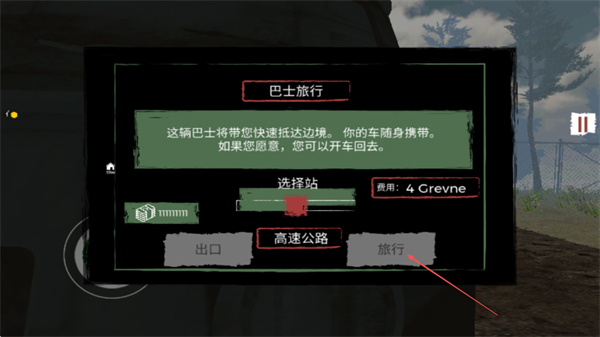 4、选择旅行选项,花费4Crevne乘坐巴士快速抵达边境,推进游戏进程。