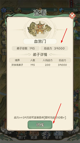 1、点击讨伐按钮攻击其他宗门,提升宗门声望与资源获取途径,战力达标后可直接吞并,获得对方战力10倍加成。