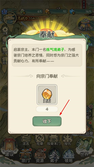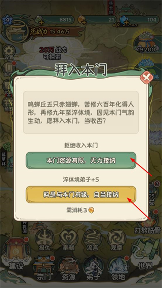 4、选择是否收纳拜入本门的弟子,可消耗资源收纳,增加弟子数量与宗门战力,资源有限时可选择拒绝。