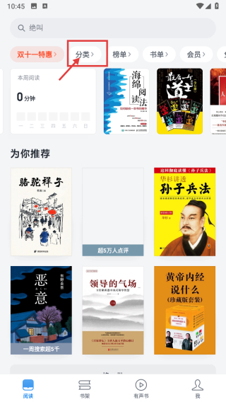 1、打开阅读类APP,点击分类选项,进入分类页面。