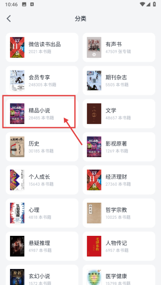 2、在分类页面,点击精品小说分类标签,进入精品小说书籍列表页面。