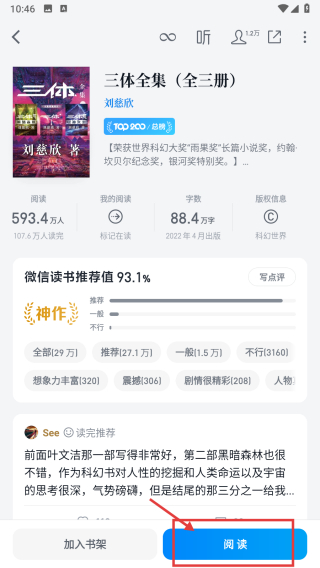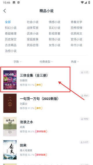 3、在精品小说书籍列表页面,选择三体全集全三册书籍,进入书籍详情页面。