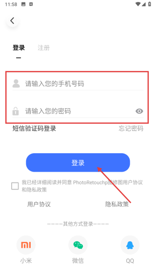 4、在账号密码登录页面,输入手机号码、密码后点击登录按钮,完成账号登录操作。