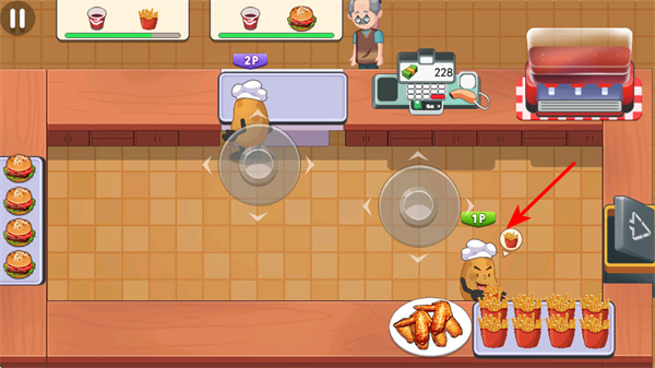 2、游戏中角色上方出现食物需求提示时,移动角色到对应食物区域拿取,满足顾客需求,这是经营获利的关键操作。