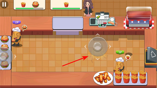 4、通过操控移动区域,灵活移动角色在餐品区和配送区之间穿梭,躲避装修砸下的木块,提升经营效率操作。