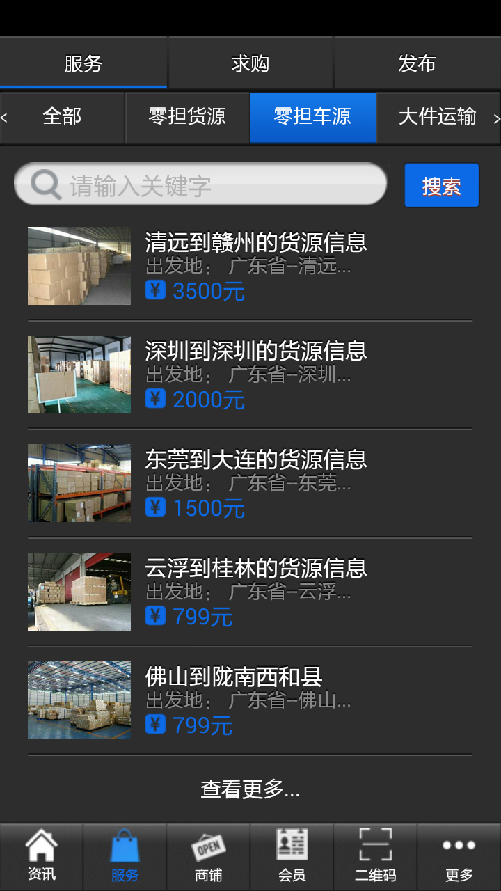 3、服务,服务展示平台,从出发地到目的地的货源信息以及价格一览