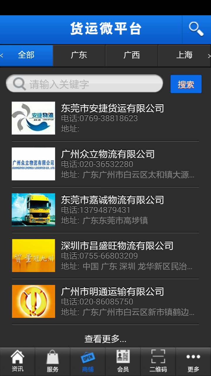2、商铺,在线查看搜索货运服务公司的信息、包括联系方式、地址等