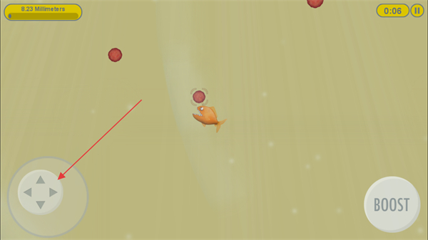2、进入游戏后你将化身为一条小鱼,通过左下角的方向键控制小鱼的移动吞食饲料。