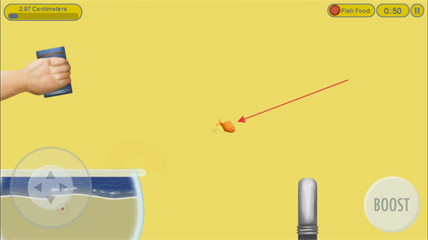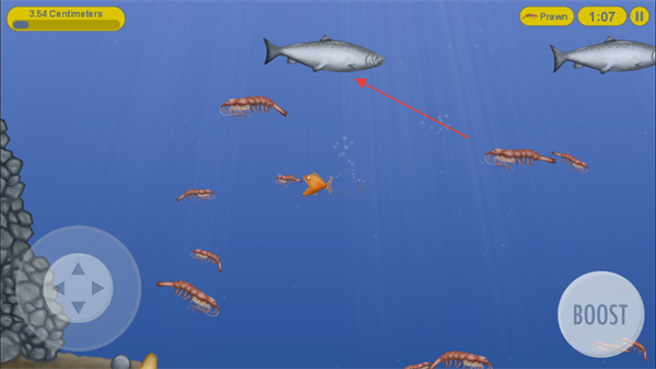 3、不断地吃饲料长到一定体型后,点击右下角的冲刺键可以控制小鱼跃出鱼缸进入新的世界。