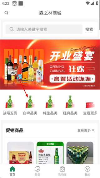 1、在森之林商城首页,点击白啤品类选项,进入白啤商品列表页。