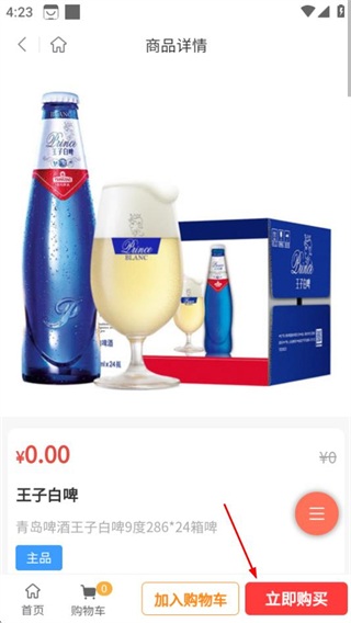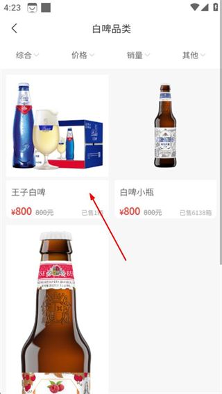 2、在白啤商品列表页,选择王子白啤,进入商品详情页面。