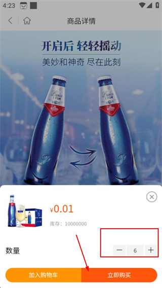 3、在商品详情页面,点击立即购买按钮,选择购买数量。