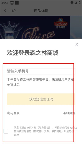 5、在登录页面输入手机号和验证码,勾选协议后完成登录,即可购买商品。