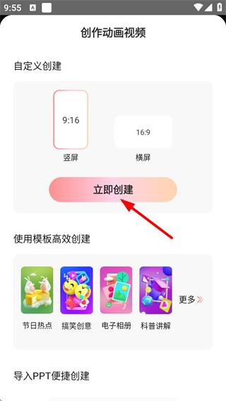 3、在创作动画视频页面选择比例,点击立即创建进入创作界面。