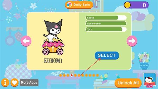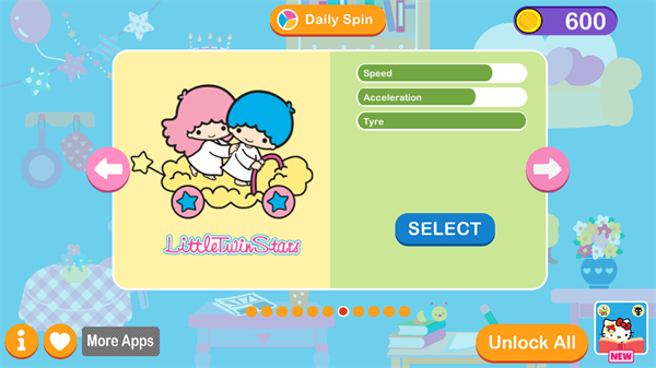 解锁凯蒂猫、玉桂狗、布丁狗等三丽鸥家族角色,每个角色配备专属赛车,如羊角面包车、鳄鱼车等,造型独特具备不同性能。