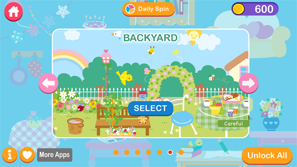 采用Q版卡通画风,角色动作俏皮,场景细节丰富,如客厅电话可触发随机事件,后院蜜蜂瓢虫互动增添游戏沉浸感。