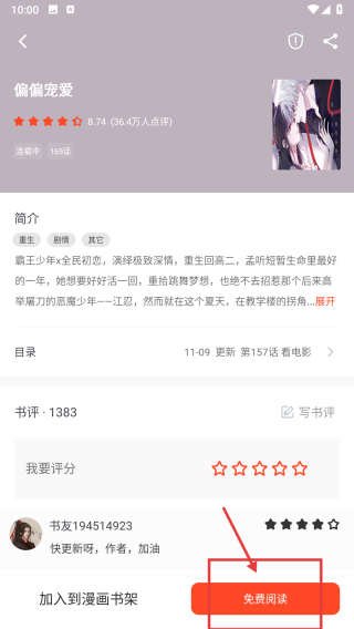 4、在漫画详情页面,点击免费阅读按钮,进行该漫画的阅读。