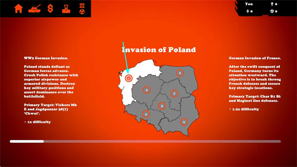 2、在关卡选择界面中,选择标注为Invasion of Poland的关卡1,进入战斗场景。
