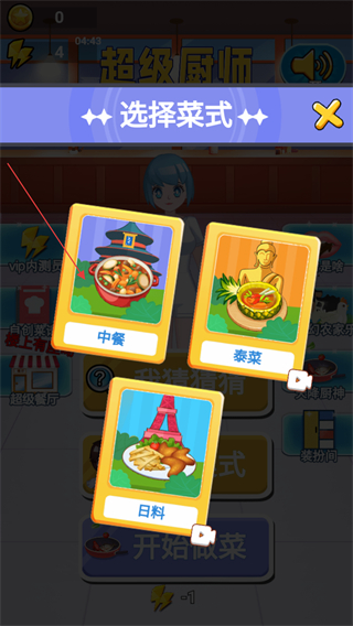 1、进入关卡后,从中餐、泰菜、日料等菜系中选择其一,确定本次烹饪的菜系方向。