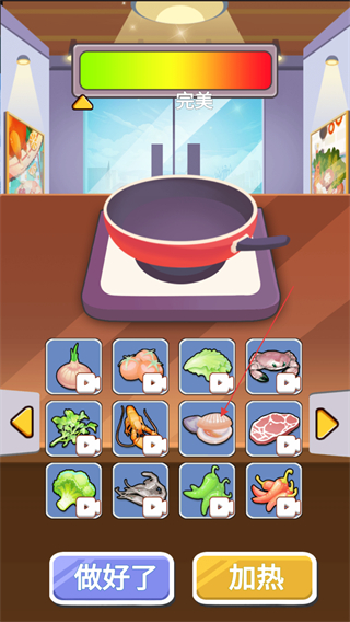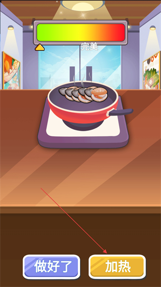 3、添加食材后,点击加热按钮开始烹饪,过程中关注上方的完美进度条。