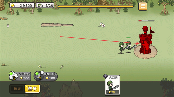 2、指挥小兵进攻敌方红色塔楼,摧毁建筑以获取胜利。