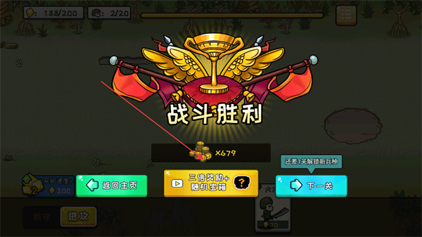 3、战斗胜利后,领取金币奖励,可选择三倍奖励或进入下一关。