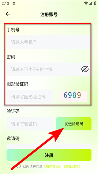 3、输入手机号、密码、图形验证码后,点击发送验证码。