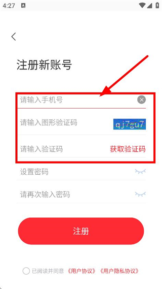 3、在注册新账号页面,输入手机号、图形验证码,获取验证码并输入。