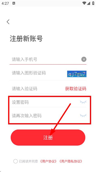 4、设置密码并再次输入,勾选已阅读并同意后,点击注册,完成注册操作。