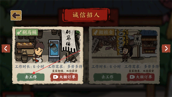 1、前往招工栏查看招聘工作信息,点击箭头选择合适的工作前往完成。