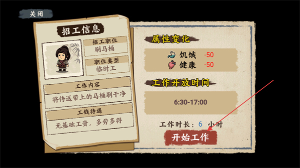 2、工作钱需要注意自身属性,饥饿值和健康度过低将无法进行工作,点击开始工作进入挑战。