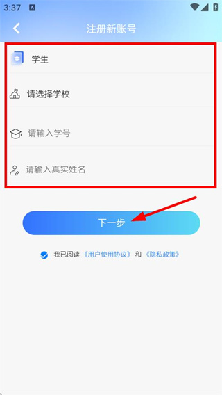 2、在注册新账号页面选择身份,填写信息后点击下一步。