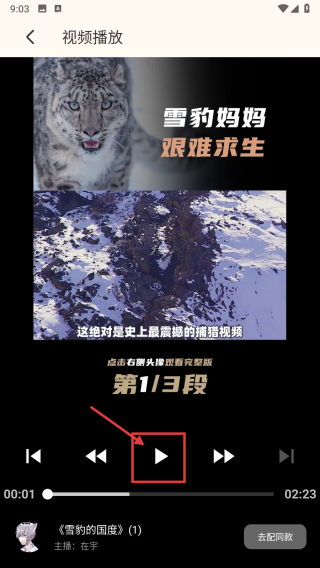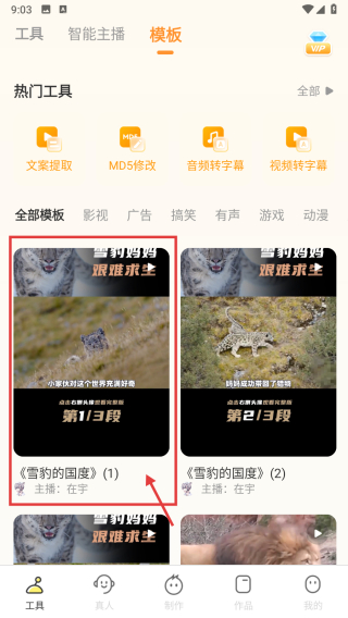 3、在模板推荐界面,选择雪豹的国度模板条目,进入视频播放页面。