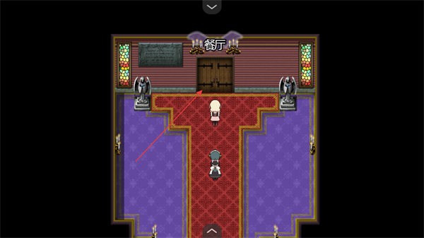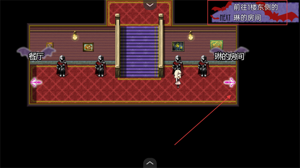 2、进入到室内时,与女仆对话完后,有明确的箭头指引路线,需前往餐厅地点推进流程。