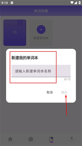 3、在新建单词本弹窗中,输入新建单词本名称后点击确定,完成单词本创建操作。