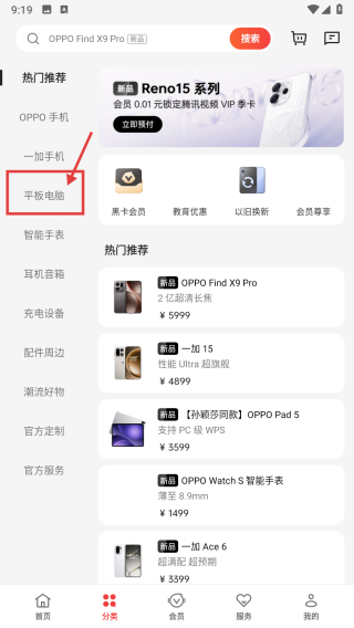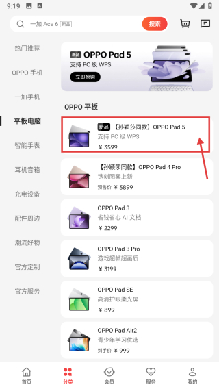 3、在平板产品列表里,选择孙颖莎同款OPPOPad5条目,进入产品详情页。
