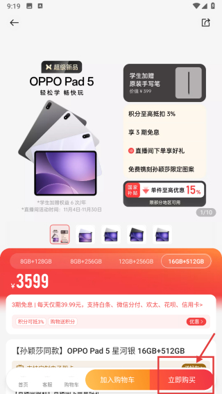 4、在产品详情页,点击立即购买按钮,进行该平板的购买操作。