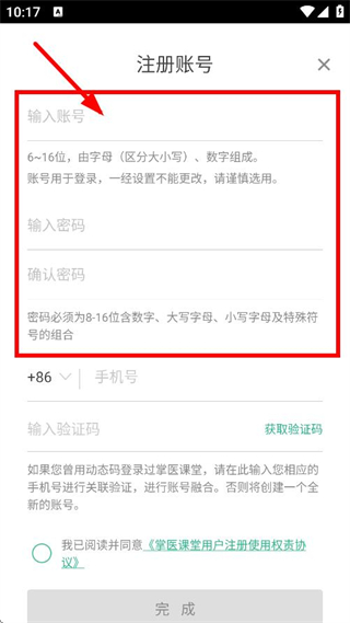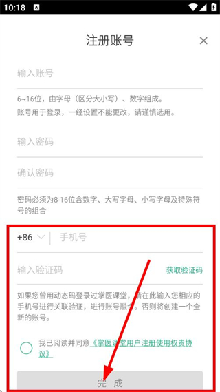 4、输入手机号,获取验证码并输入,点击完成,完成注册操作。