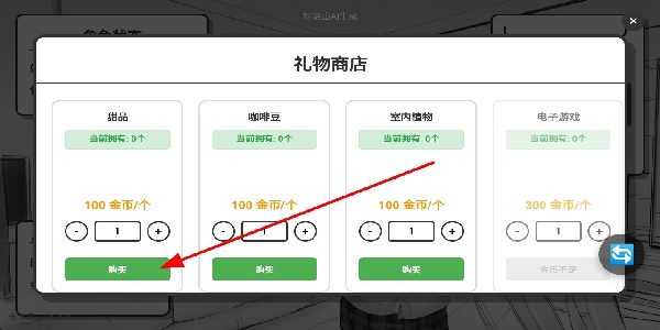 2、礼物商店用金币购买战品、咖啡豆等礼物资源,用于提升与妹妹的好感度,助力互动相处。