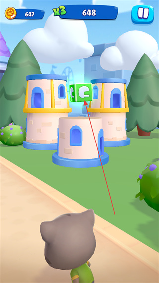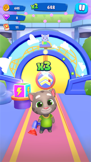采用鲜明卡通画风,汤姆猫造型萌趣可爱,赛道场景色彩明快,从绿意公园到趣味赛道,每个场景细节丰富,搭配轻快音效,营造出轻松欢乐的跑酷氛围。