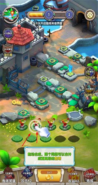 1、通过拖动合成塔防建筑,两个同等级塔可合成更高等级塔,提升防御能力。
