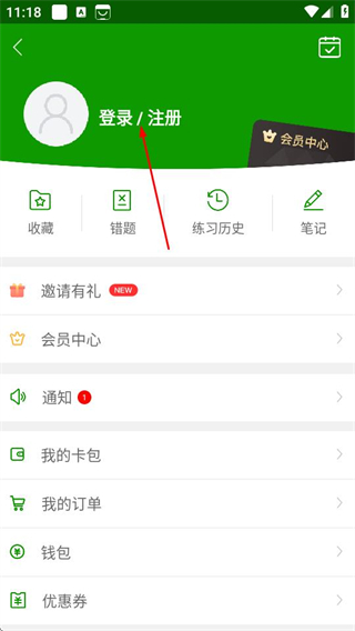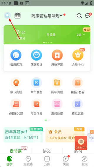 1、在执业药师万题库首页,点击左上角头像图标,进入个人页面。