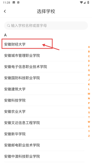 2、在选择学校列表页,选择安徽财经大学,返回学校选择页面。